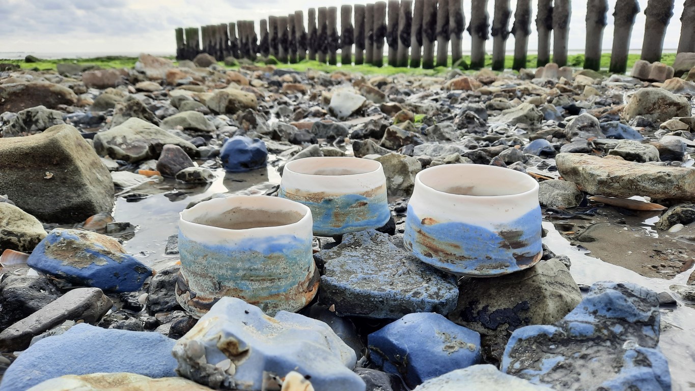 De Kwelderserie is geïnspireerd op het Wad en haar kwelders, met haar prachtige grijsblauwen, groengrijzen en zanderige bruinen. Wanneer de klei nog vormbaar is, pas ik gevonden drijfhout, schelpen en plantaardige materialen toe om daarmee de vorm het landschappelijke karakter te geven wat kenmerkend is voor deze serie. Het toepassen van porselein refereert aan de wolkenluchten die weerspiegeld worden in het Wad. In al mijn werk speelt de geschiedenis van het gebied een belangrijke rol, wat in de Kwelderserie tot uiting komt door de grondlagen te verwerken in de kleuropbouw op de objecten.